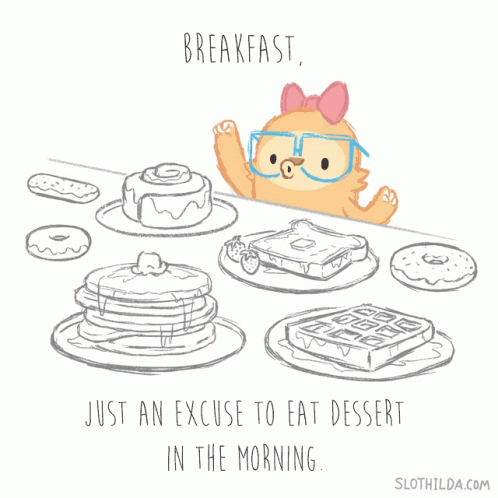 Cute sloth character with glasses surrounded by breakfast desserts, with a humorous quote about breakfast.