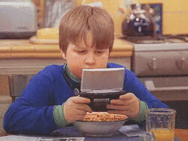 Jake Harper, a young boy, attempts to play a handheld video game while eating cereal for breakfast.