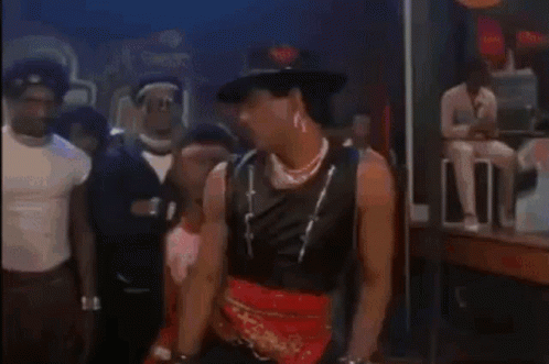 Turbo breakdancing in a club scene from the movie Breakin', surrounded by a lively crowd.