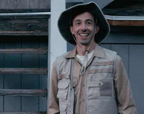 Brian Rosenthal of Tin Can Bros, wearing a hat and vest, points with a surprised and excited expression.