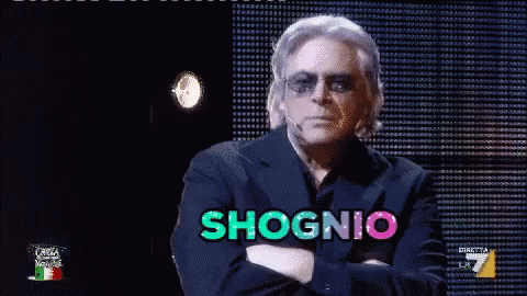 Flavio Briatore, possibly impersonated by Maurizio Crozza, stands with arms crossed in front of a screen displaying "SHOGNIO".