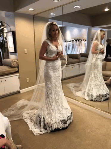 A bride tries on various wedding dresses in front of a mirror, assisted by a consultant.