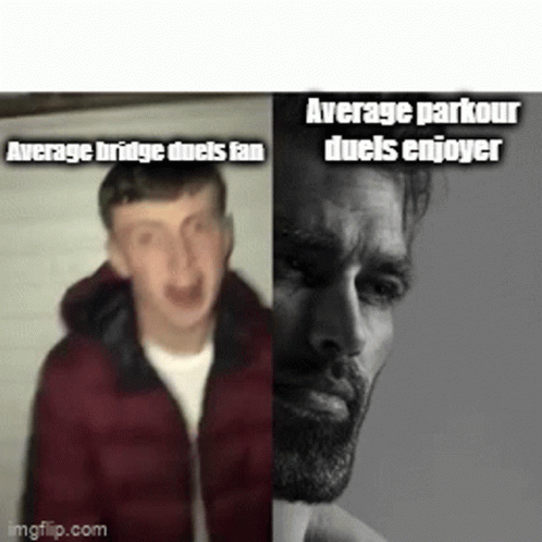 A humorous meme contrasting the 'Average bridge duels fan' with the 'Average parkour duels enjoyer' in Hypixel.