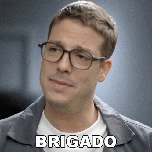 Fabio Porchat expresses gratitude with 'Brigado' on screen, wearing glasses and a jacket.