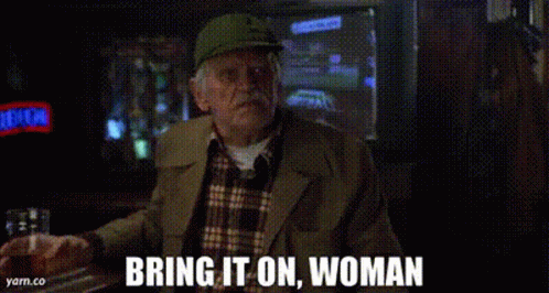 An older man from Big Daddy, wearing a cap, challenges someone by saying 'Bring it on, woman'.