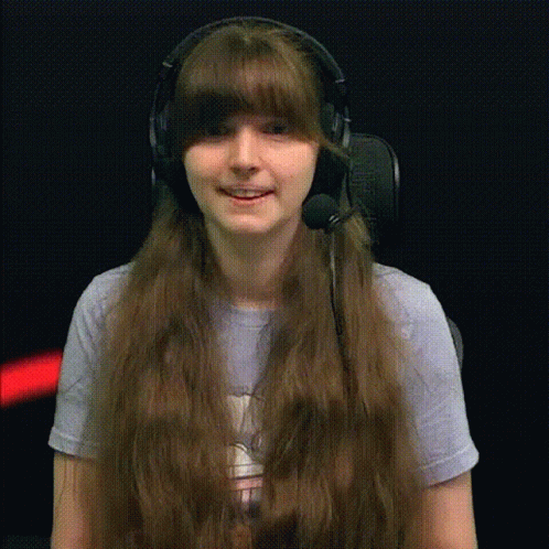Briony from Yogscast gives a double thumbs up to the camera while wearing headphones and smiling.