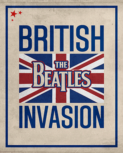 A vintage-style poster commemorating The Beatles' British Invasion and the Beatlemania phenomenon.