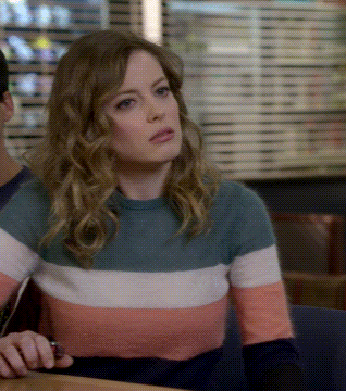 Britta Perry gestures to Jeff Winger, who looks on with a smirk, in a scene from Community.