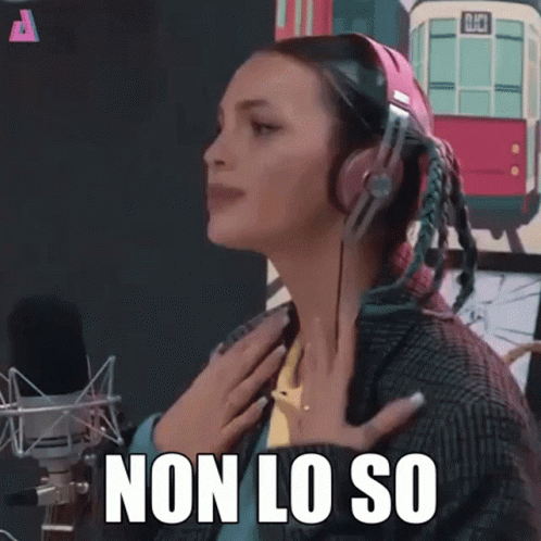 Annalisa or Rose Villain reacting with 'brividi' (shivers) into a microphone, wearing headphones and a plaid jacket.