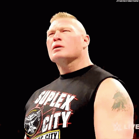 Brock Lesnar, the Universal Champion, looks confused and disgusted in the wrestling ring.