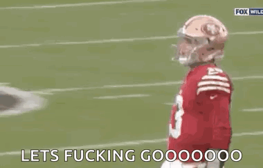 Brock Purdy, quarterback for the San Francisco 49ers, celebrates with an excited fist pump on the field.
