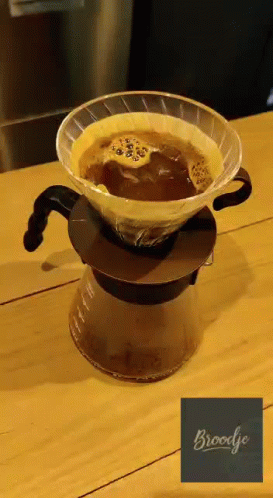 Enjoying a delicious fresh pour-over coffee being brewed into a glass carafe on a wooden table.