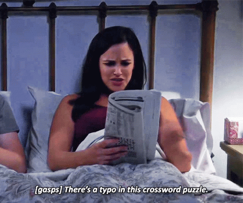 Amy Santiago (Melissa Fumero) from Brooklyn Nine-Nine gasps in bed after finding a typo in her crossword puzzle.