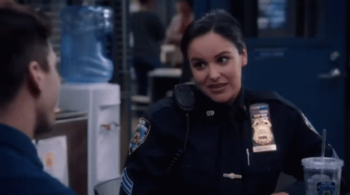 Amy Santiago (Melissa Fumero) from Brooklyn Nine-Nine shares a nervous, awkward laugh.