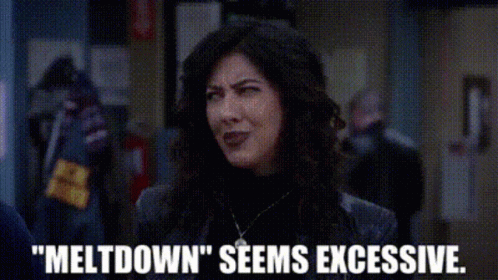 Rosa Diaz from Brooklyn Nine-Nine reacts with her iconic line, 'Meltdown' Seems Excessive, in a hallway scene.