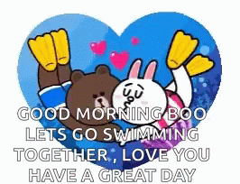 Brown and Cony swim happily in a heart-shaped pool, sharing a 'Good Morning Boo' message and love.