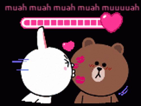 Brown the bear gets showered with kisses from Cony the rabbit, filling up the 'Kiss O Meter' with love.