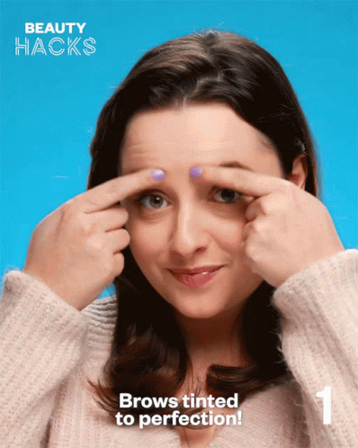 A woman demonstrates a beauty hack for perfectly tinted brows, ideal for brunettes.
