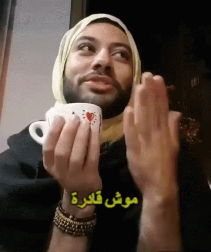 Barshoumi, wearing a headscarf, holds a coffee cup with a heart, expressing 'I can't' in a funny moment.