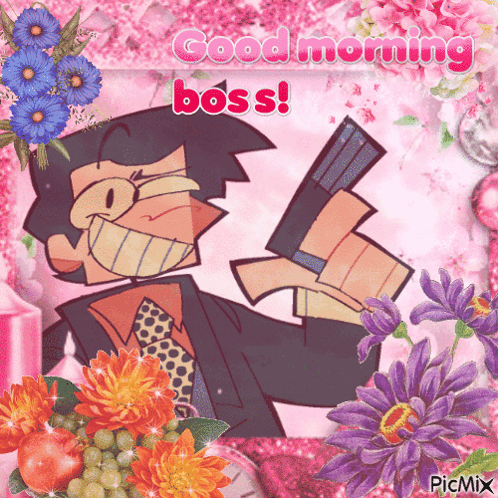 Bruce Coddle from Terminal City Ricochet in an animated image, grinning and holding a weapon, with 'Good morning boss!' text.