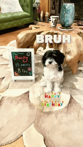 A cute black and white puppy named Bucky celebrates his birthday, sitting next to a sign detailing his age and weight.