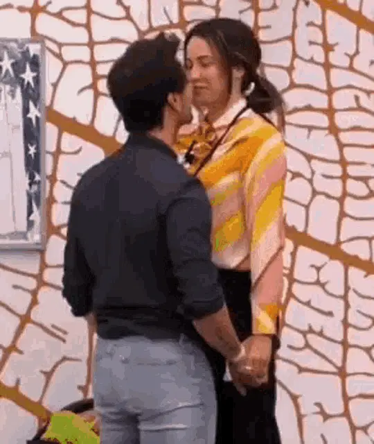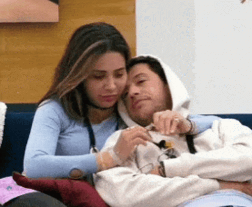 Bruna Gomes affectionately kisses Bernardo Tomas while they relax together on a couch.