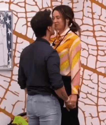 Bernardo Tomas and Bruna Gomes share a tender kiss, holding hands in front of a patterned wall.