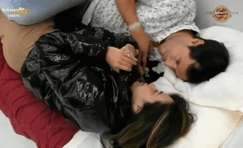Brunardo and Bruna Gomes share a playful and intimate moment on a bed, laughing together.