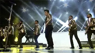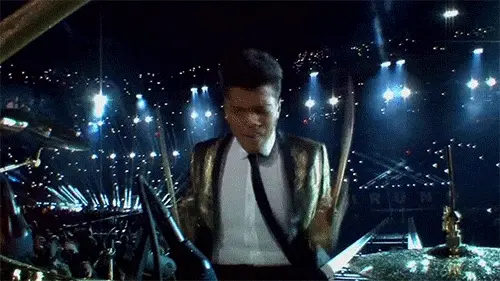 Bruno Mars performs 'Leave the Door Open,' wearing glasses and a beret, with a charismatic smile.