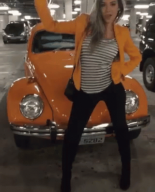 Brusantanareal strikes a funny pose in front of a classic orange Volkswagen Beetle car.