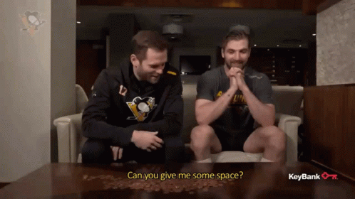 Bryan Rust playfully asks Zach Aston Reese for some personal space while sitting together.