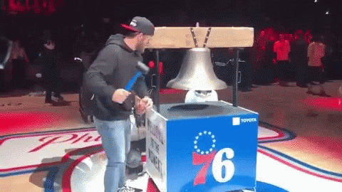 Bryce Harper, wearing a cap and hoodie, enthusiastically rings the Philadelphia 76ers bell with a hammer.