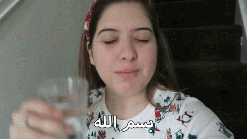 A woman holds a glass of water and says 'Bismillah' before drinking, showing a happy smile.