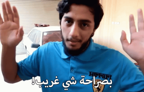 Saad Speed, wearing a blue Ferrari shirt, waves his hands and exclaims "Honestly, something strange!" in Arabic.