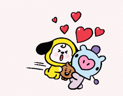BT21 characters Chimmy and Mang share a warm hug, surrounded by floating hearts.