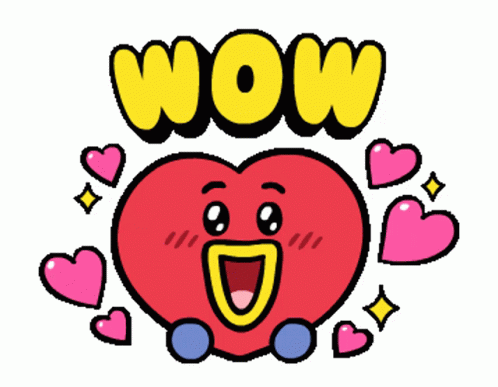 BT21's Tata character expresses pure excitement with a big 'WOW!' surrounded by floating pink hearts.