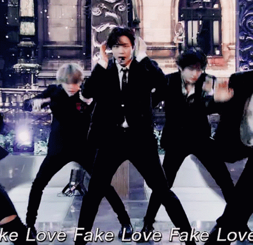 BTS members, including 석진 (Seokjin), perform their hit song 'Fake Love' with dynamic choreography.