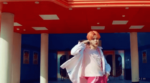 Jimin from BTS performs 'Boy With Luv' with vibrant pink hair in a colorful setting, showcasing his dynamic dance.