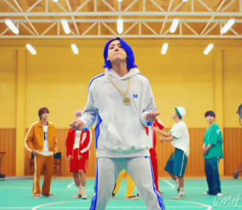 Jungkook with blue hair dancing to BTS Butter in a vibrant gym with other BTS members.