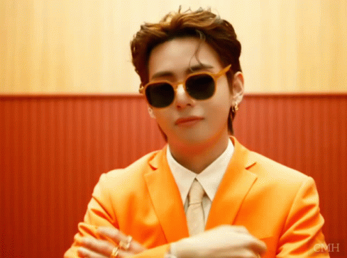 Taehyung from BTS smiles confidently in an orange suit and matching sunglasses for the 'Butter' era.
