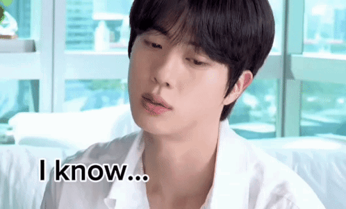 BTS member Jin gives a playful side-eye and a naughty smile, with the caption 'I know... right?'