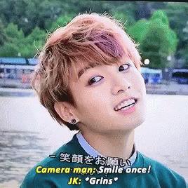 BTS member JK grins charmingly for the camera, responding to the cameraman's request to smile.