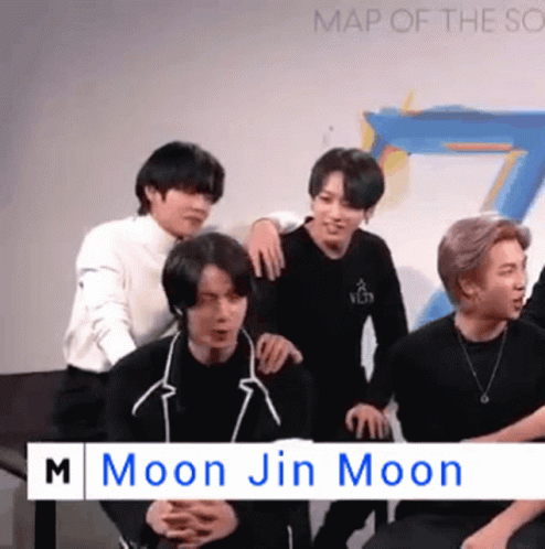 BTS members Jin and Jungkook with other members, sitting together in front of a 'Moon Jin Moon' sign.