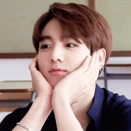 BTS member Jungkook smiles adorably while holding his face with his hands.
