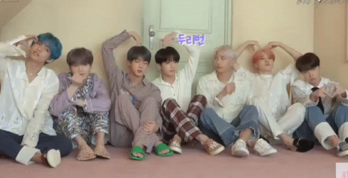 Bts members, including Kim Namjoon (RM), sitting together and making heart shapes with their hands.