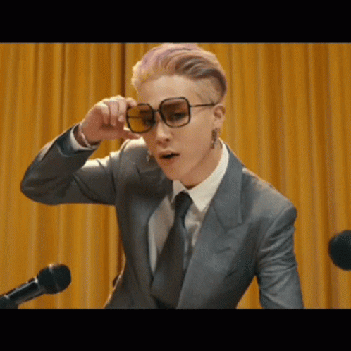 BTS member Jimin in a suit and tie, adjusting his sunglasses in the 'Rainbow' music video.