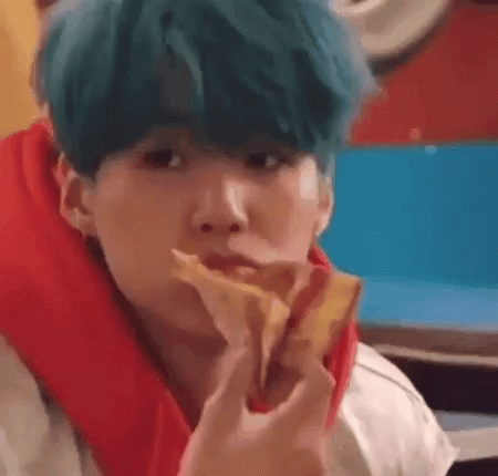 BTS member Suga with blue hair enjoys a slice of pizza, looking around while he eats.