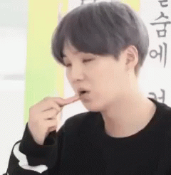 BTS member Suga, with gray hair, eats a snack by putting his finger in his mouth.