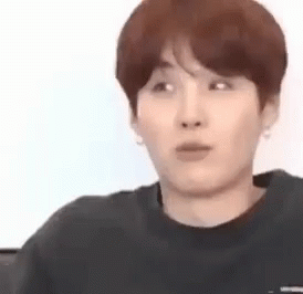 BTS member Suga makes a funny, surprised face, looking off to the side.