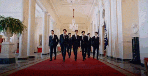 BTS members walk confidently in black suits through the grand hallway of the White House in Washington.
